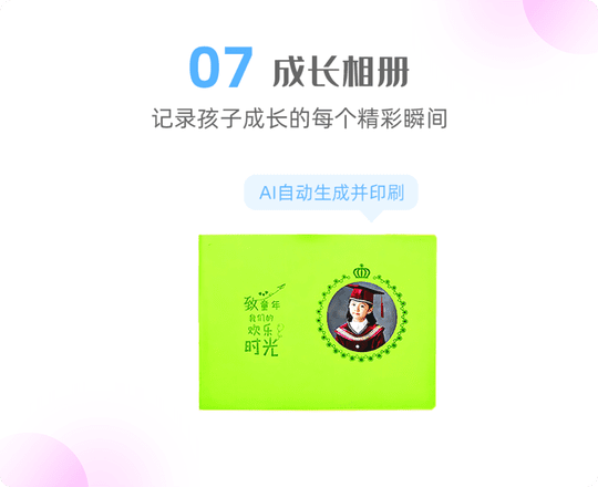 将孩子每个学期的里程碑和感动瞬间,用AI自动生成时光册故事集并印刷留念